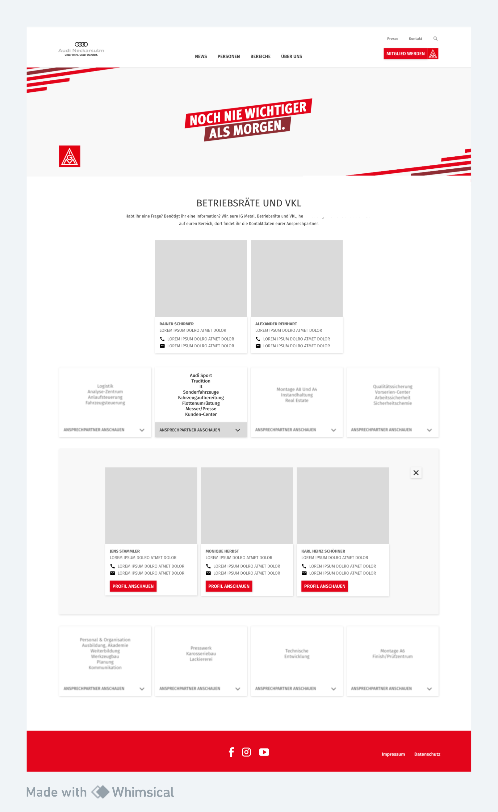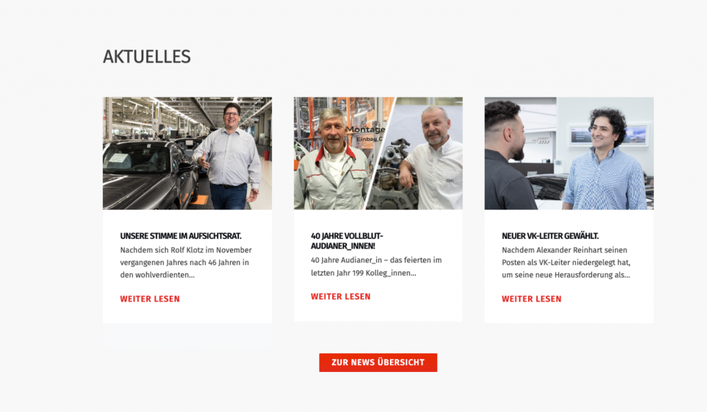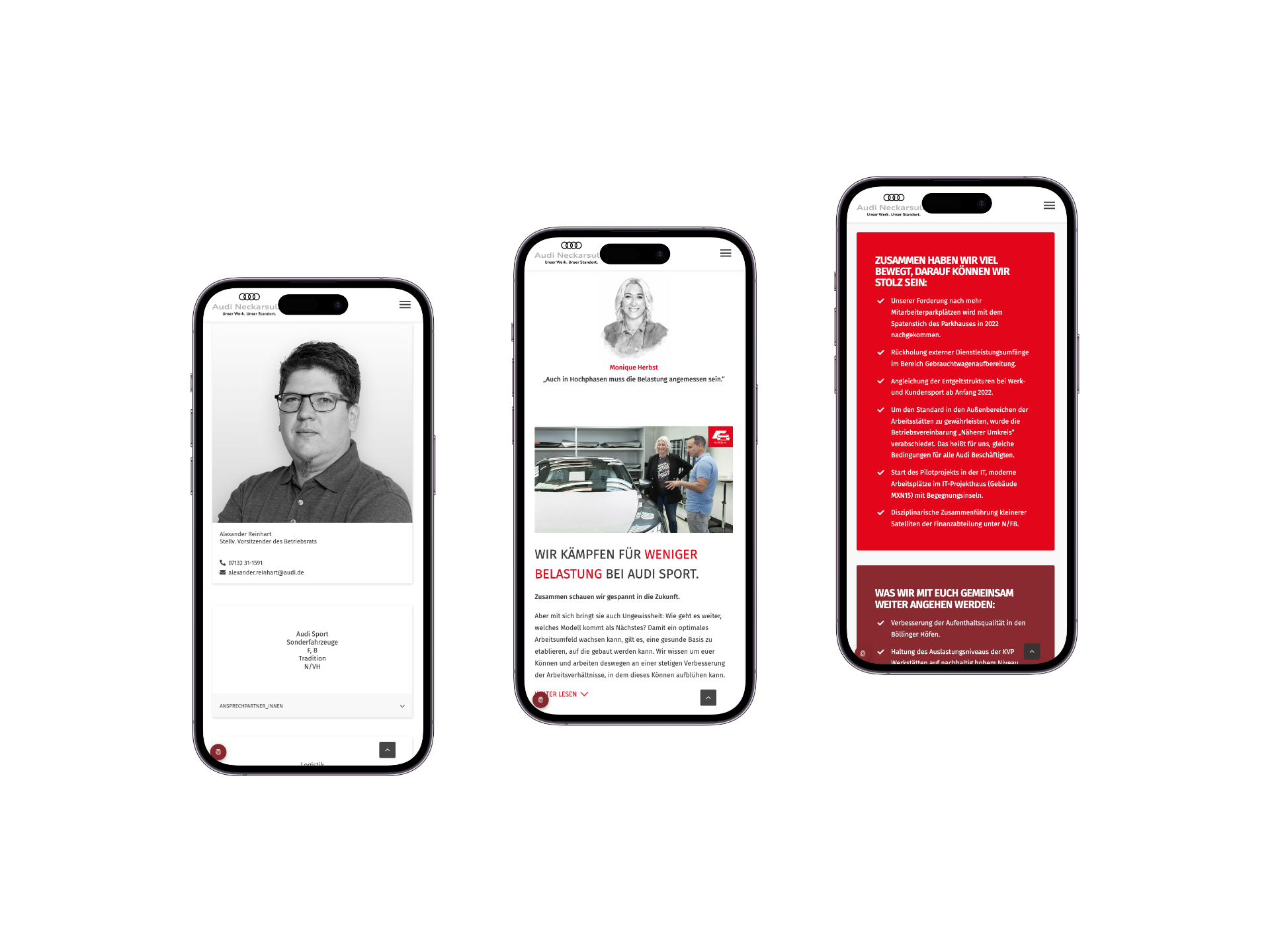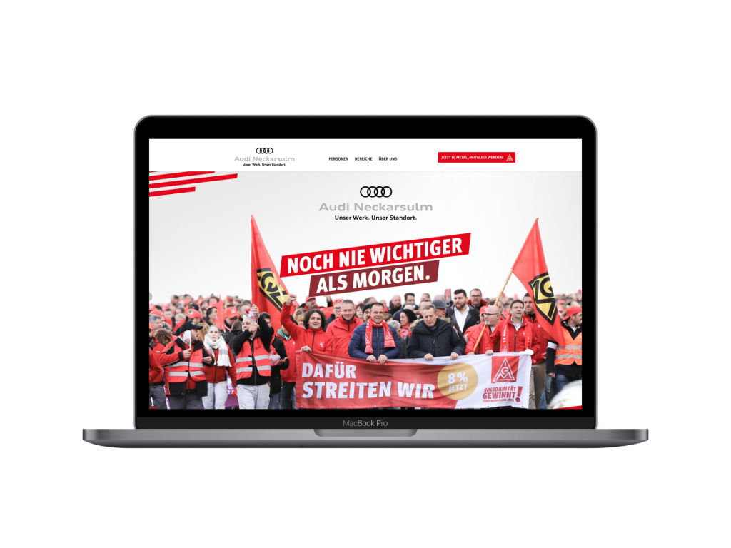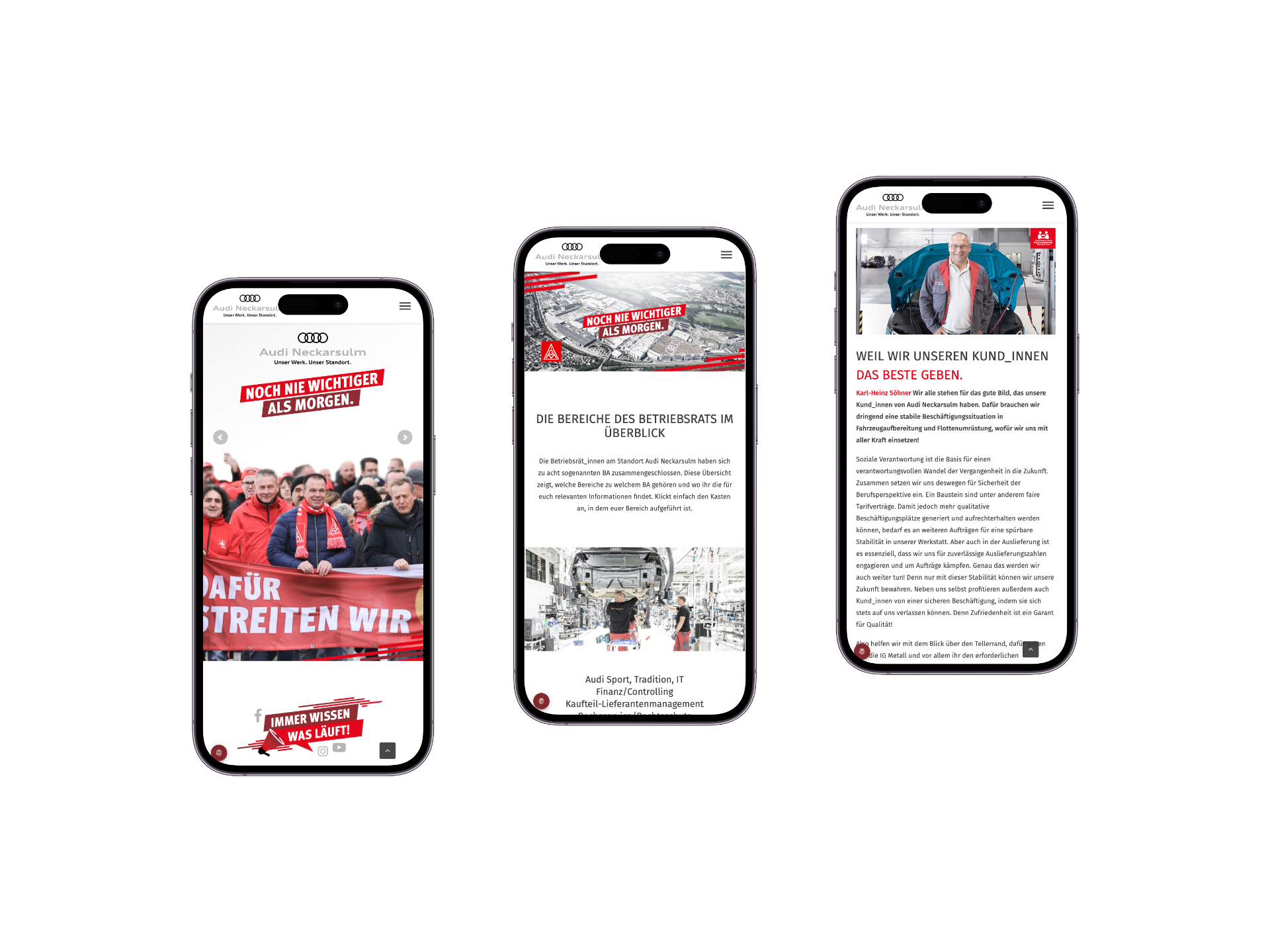 Für Audi Neckarsulm der Gewerkschaft IG Metall wurde konzeptionell eine Webseite gelauncht, mit dem Ziel die Mitarbeiter über die Betriebswahlergebnisse und über die interne Projekte zu informieren.