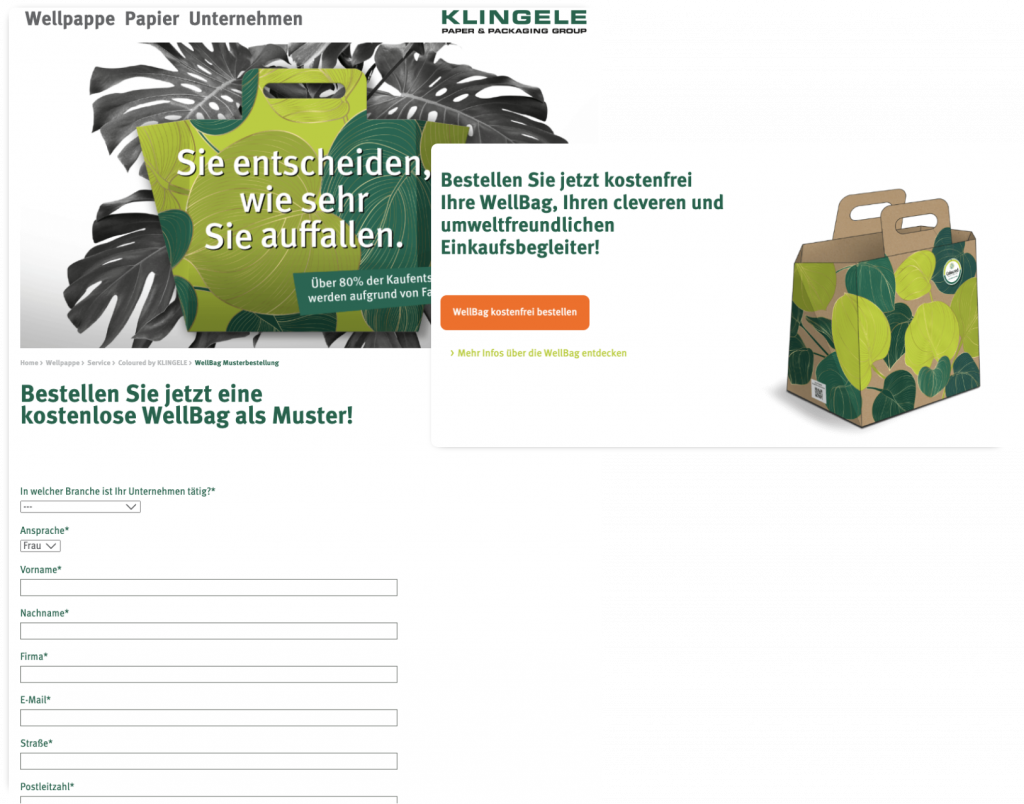 Die Landingpage soll Leads für Klingele generieren. Dies kann durch die Möglichkeit der Kontaktaufnahme, den Download einer Checkliste und die Bestellung einer kostenlosen Verpackungsprobe erreicht werden, indem Kunden ihre Daten eingeben
